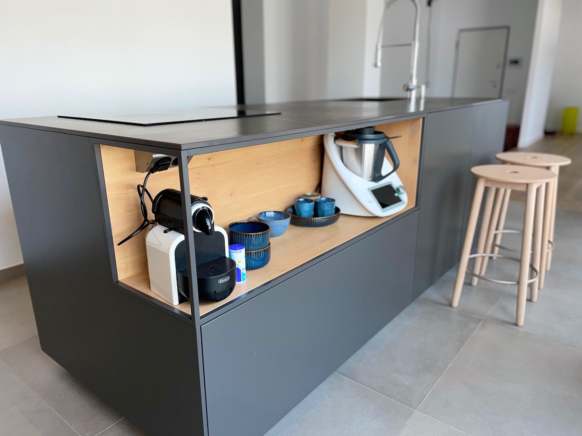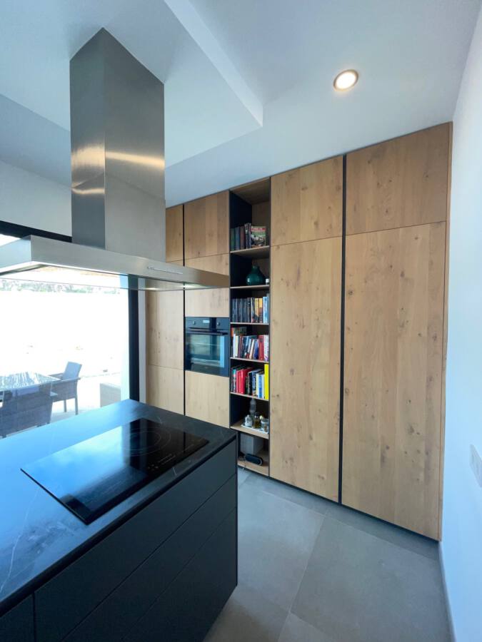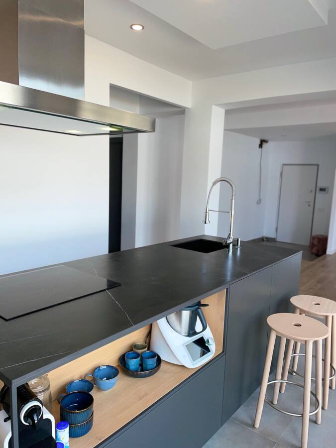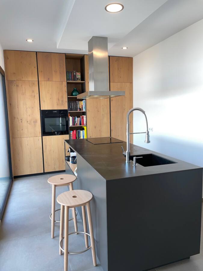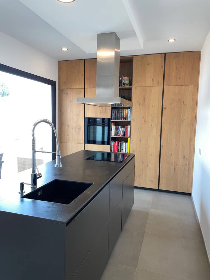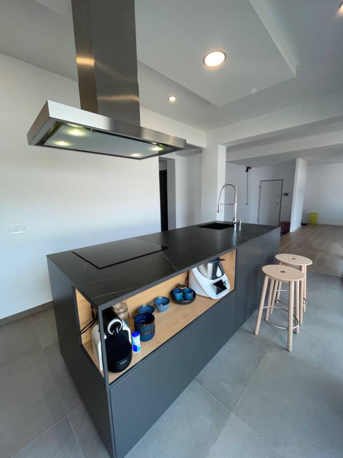 Todo ello se acompaña de una encimera porcelánica de Inalco modelo negro natural. El equipamiento de esta cocina con grifo industrial de GRB se completa con los frigos integrados, el horno AEG y la campana de isla marca Guttman.