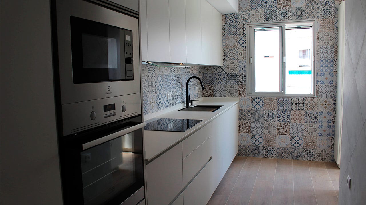 La cocina de Dica, modelo Milano 45, es en color Blanco Latte y se combina con una encimera de material porcelánico también en blanco. Todo en esta impresionante cocina en Lora del Río está pensado para hacer destacar la estancia, en especial el azulejo hidráulico de las paredes.