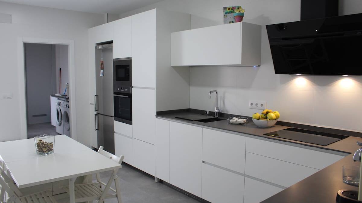 En las imágenes vemos una cocina blanca, una elección muy acertada debido a la potente entrada de luz natural desde el salón. El equipamiento se compone de campana Elica negra y electrodomésticos en acero, a los que se suman pequeños electrodomésticos en la encimera y un televisor colgante en un lateral.