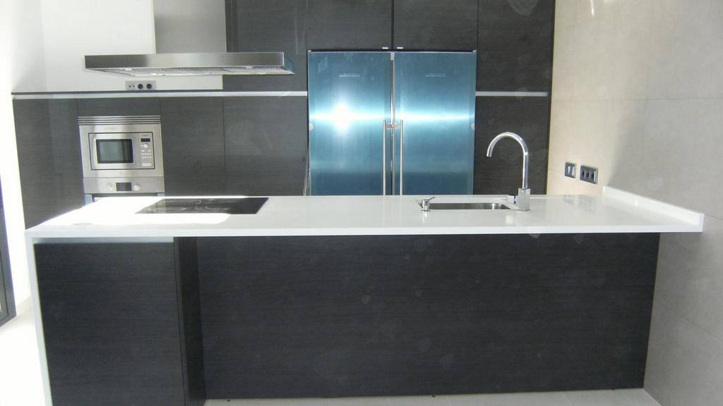 Junto a esta preciosa cocina, le acompaña una encimera maciza de 3 cm de la marca Silestone en color blanco Zeus. Un color que hace el contraste perfecto con el color roble grafito del mueble de cocina.