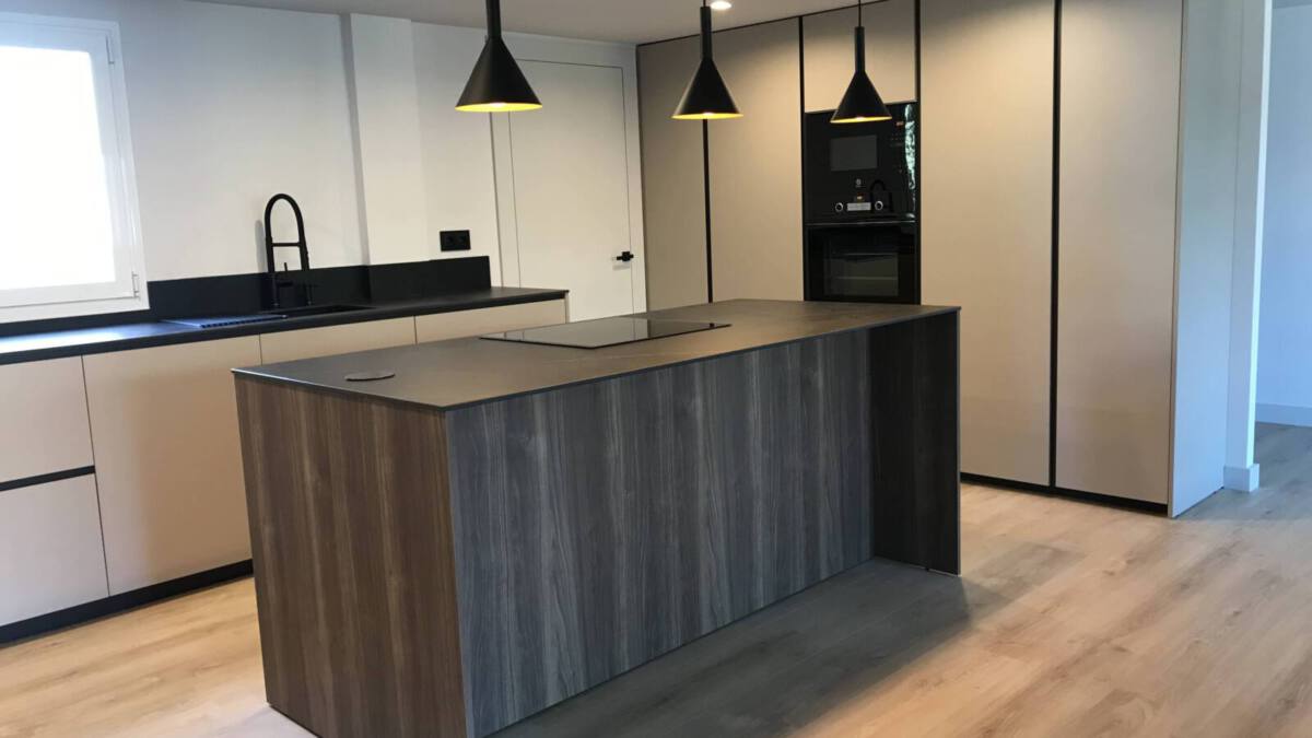 La campana es de Frecan, y es de techo. Junto a ella aparecen tres lámparas colgantes que iluminan la zona de la isla, con luces de tono cálido.. Este es el área de cocción, pero también puede servir como espacio para pequeños aperitivos. Incluye salida oculta para la basura, algo muy propio de las cocinas modernas.