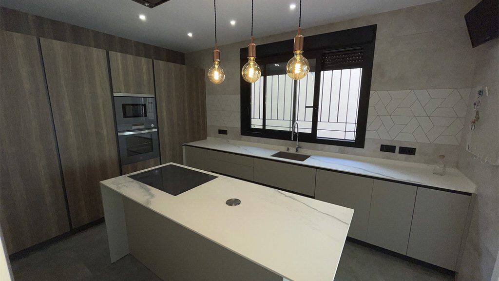 visualmente, muy cómodo y funcional. Esta es una cocina de km 0 que incorpora encimera porcelánico