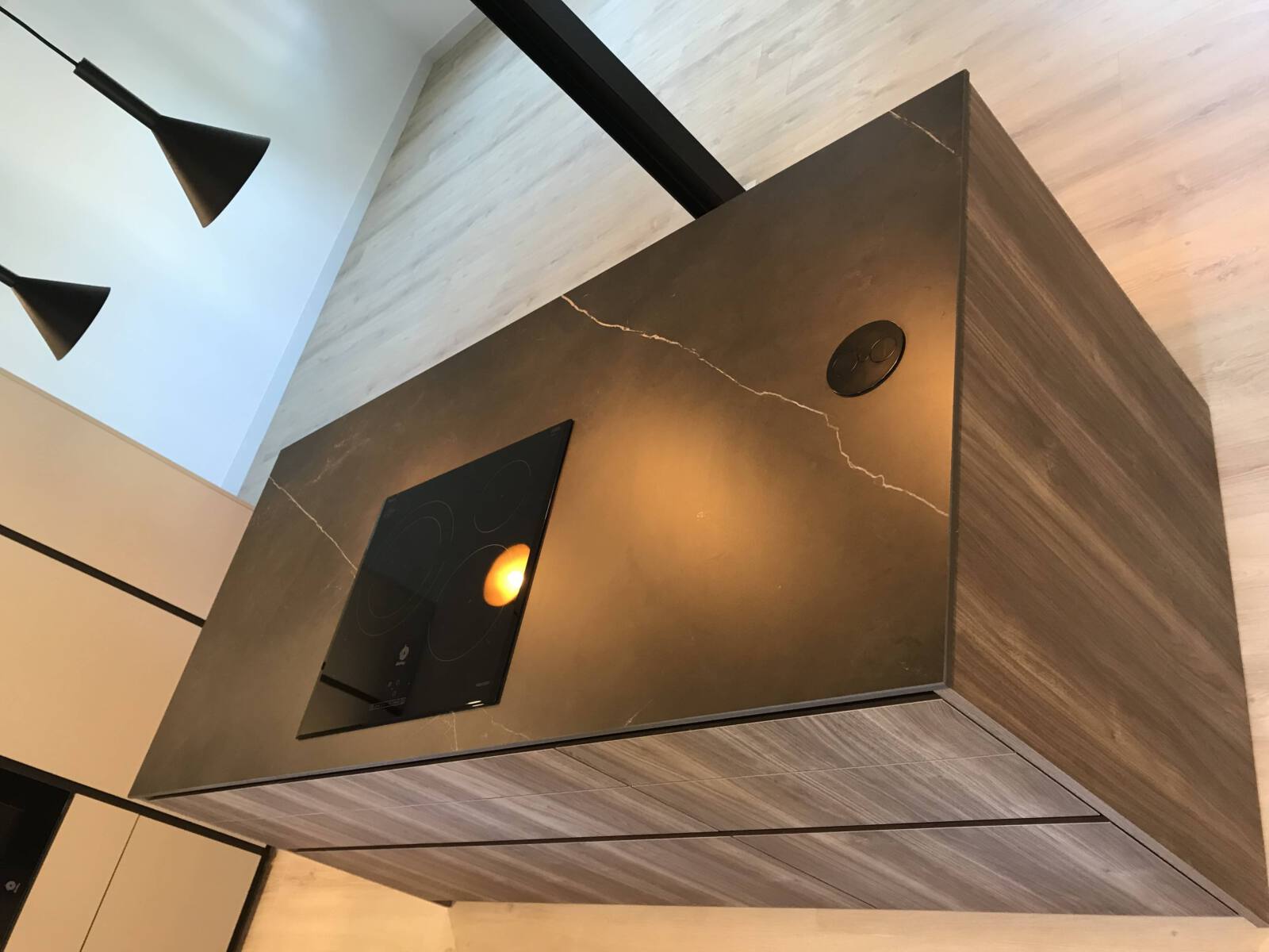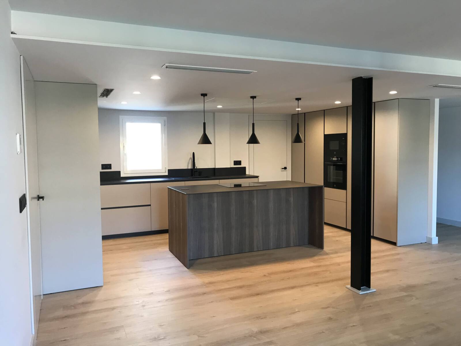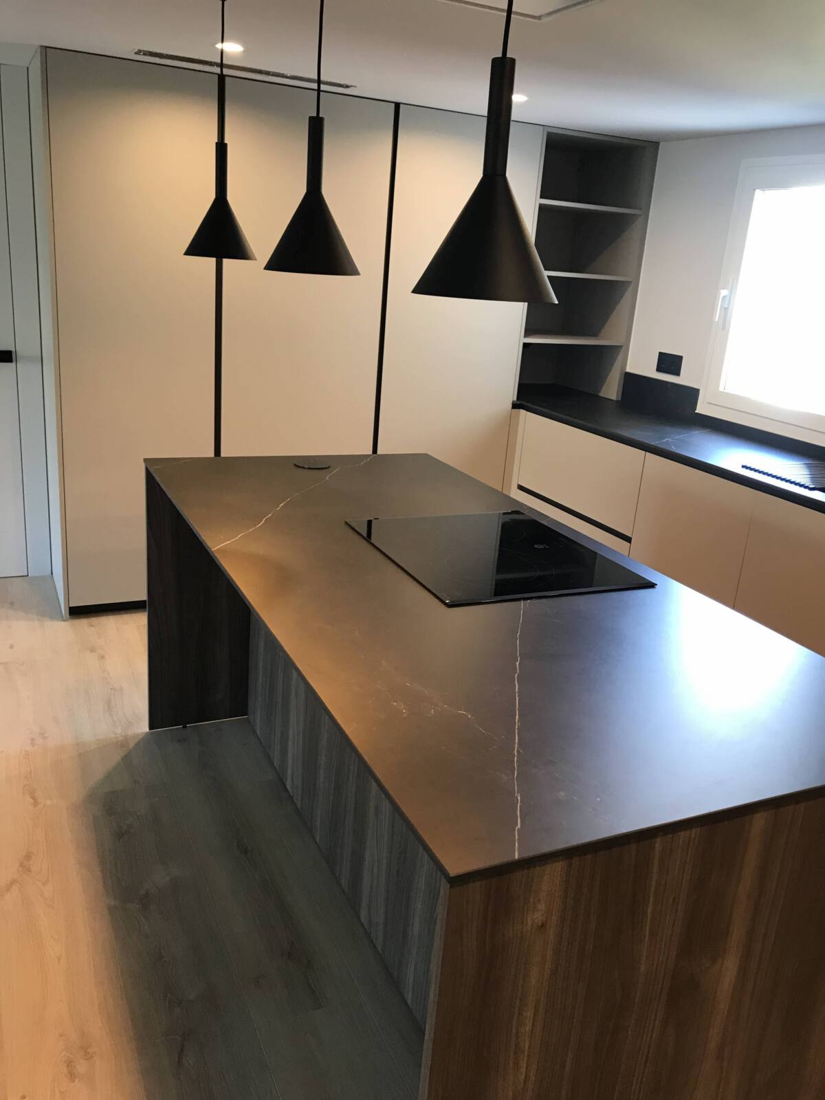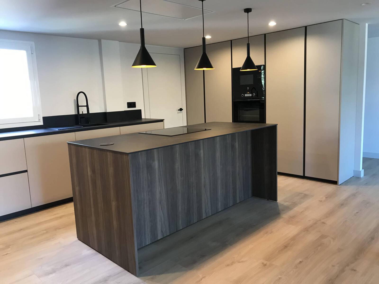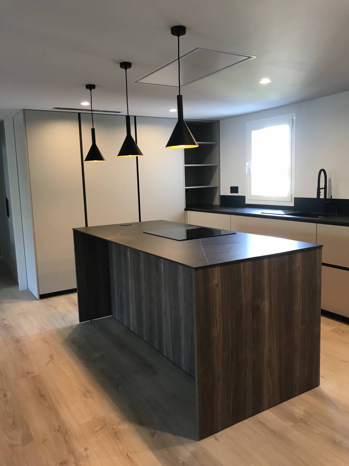 La campana es de Frecan, y es de techo. Junto a ella aparecen tres lámparas colgantes que iluminan la zona de la isla, con luces de tono cálido.. Este es el área de cocción, pero también puede servir como espacio para pequeños aperitivos. Incluye salida oculta para la basura, algo muy propio de las cocinas modernas.