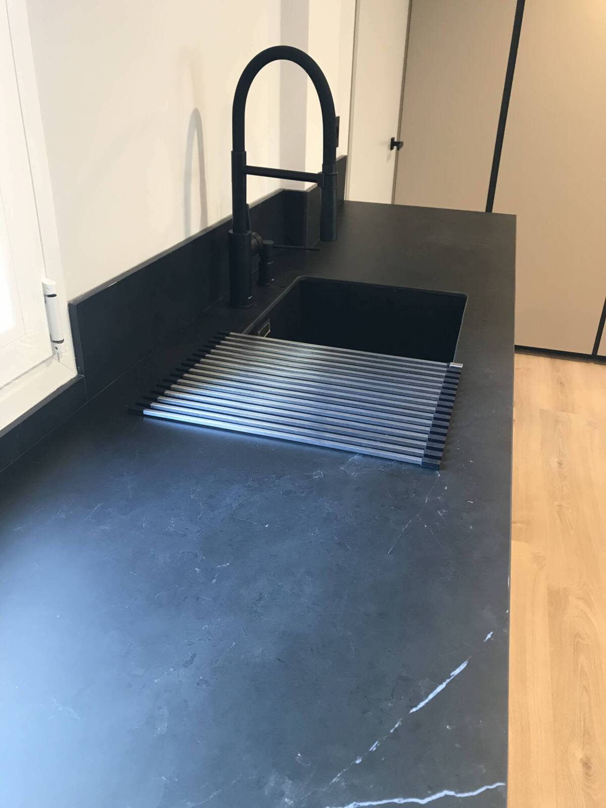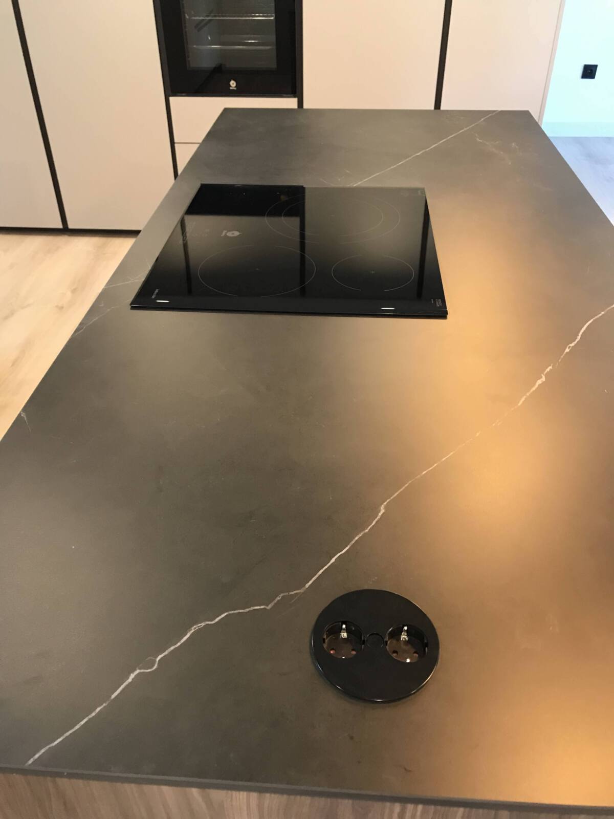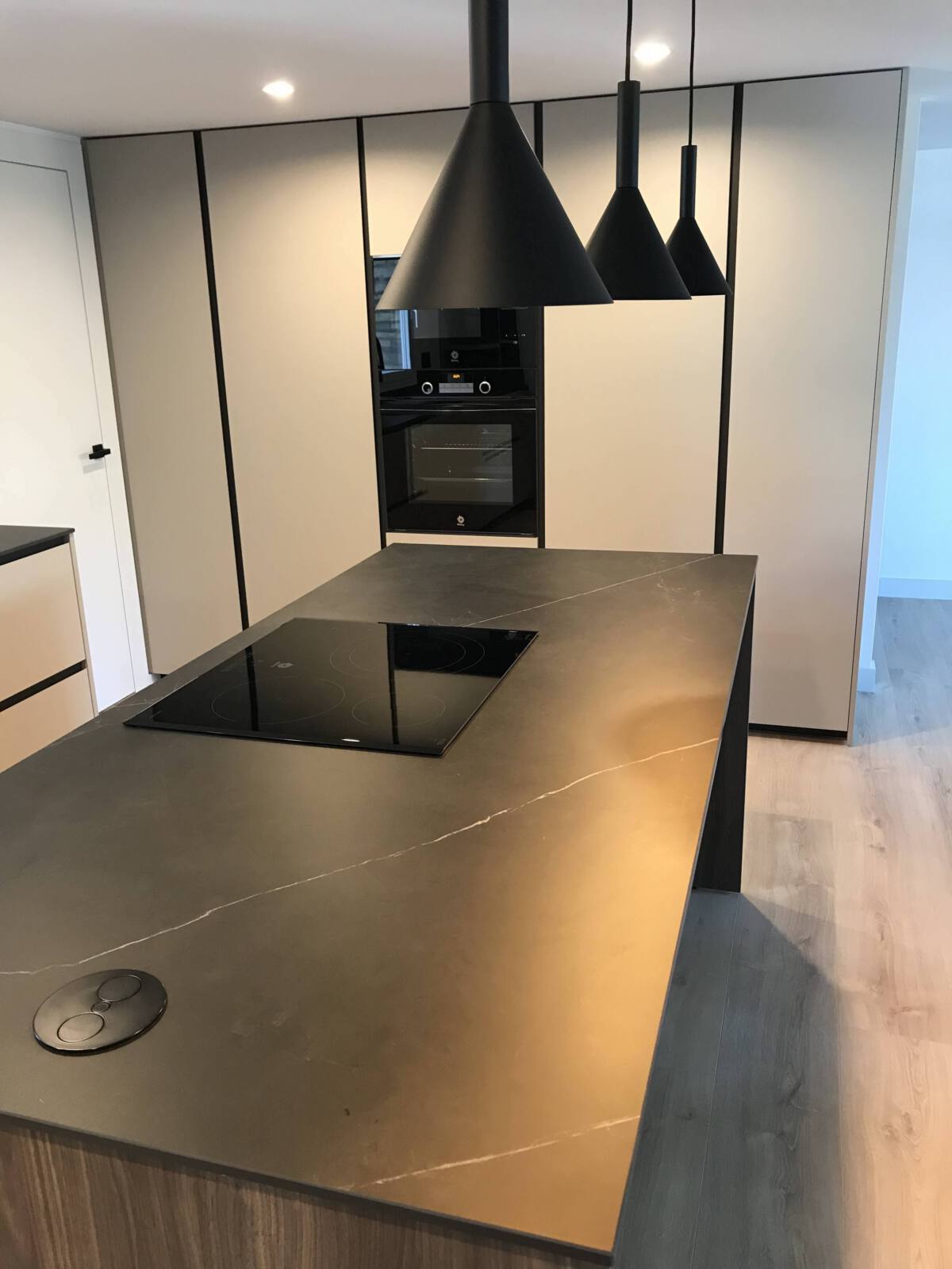 La encimera, al fondo de la cocina y junto a la zona de aguas, es de Inalco, color Storm negro natural, para hilar estéticamente con los electrodomésticos. Tras este fondo aparece un gran ventanal que aporta mucha iluminación natural a la estancia. Y para completar el apartado de iluminación, apliques de techo con luz neutra. Una cocina funcional, muy bonita y excelentemente equipada.