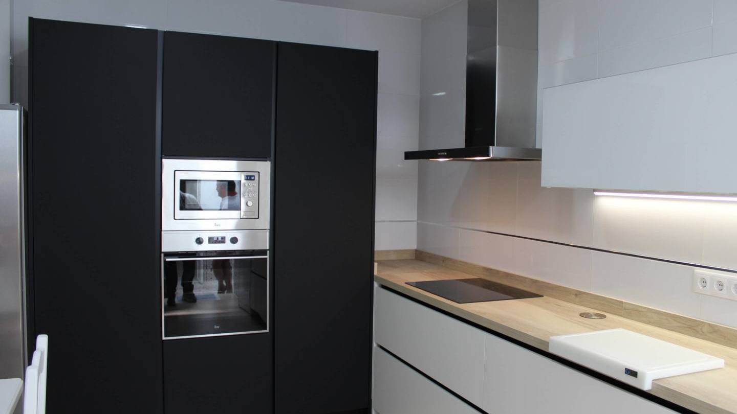 Pero por encima de todo, en esta cocina con puertas con nanotecnología, debemos resaltar los muebles columna tipo armario en color negro que rodean por completo a horno y microondas y que contrastan por completo con los tonos claros del resto de la cocina.