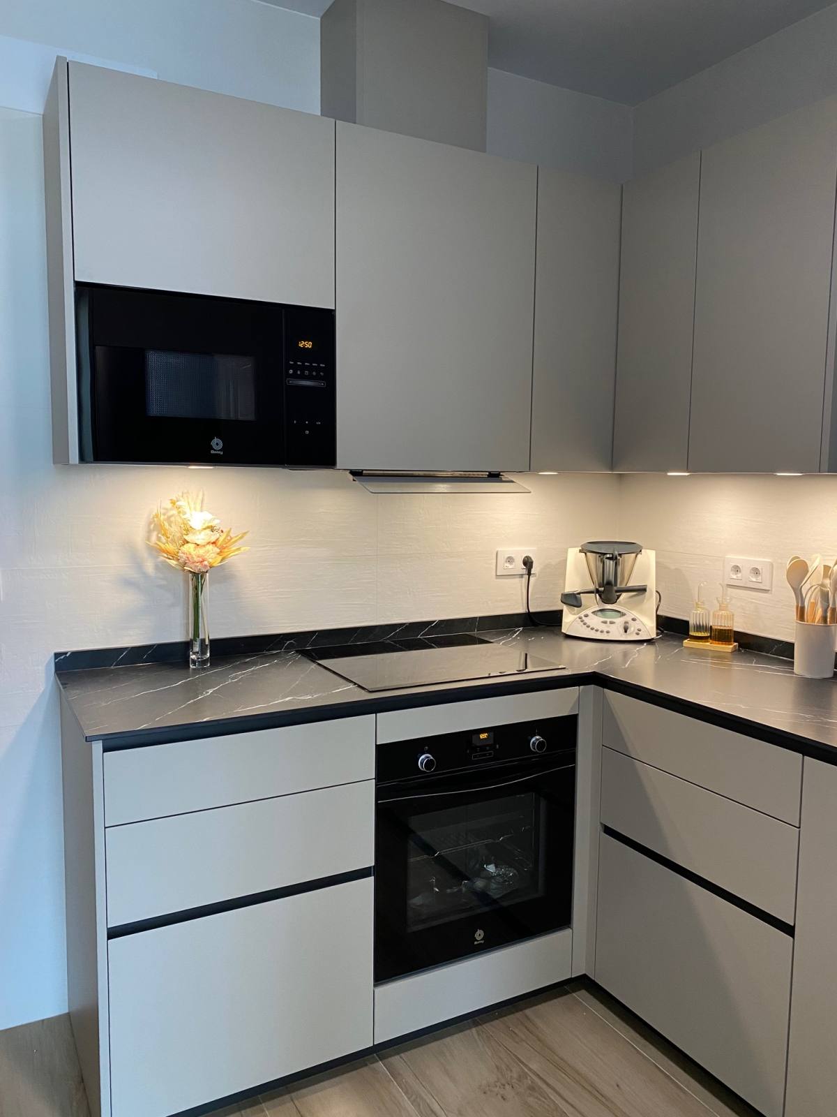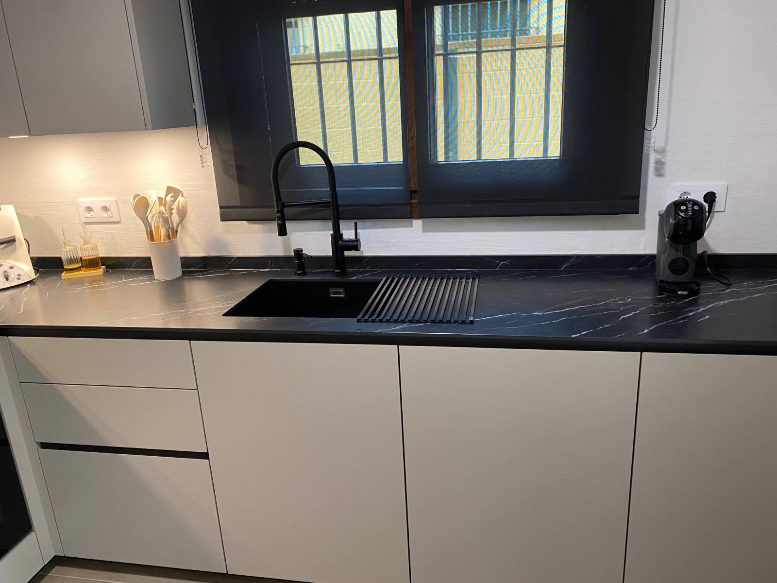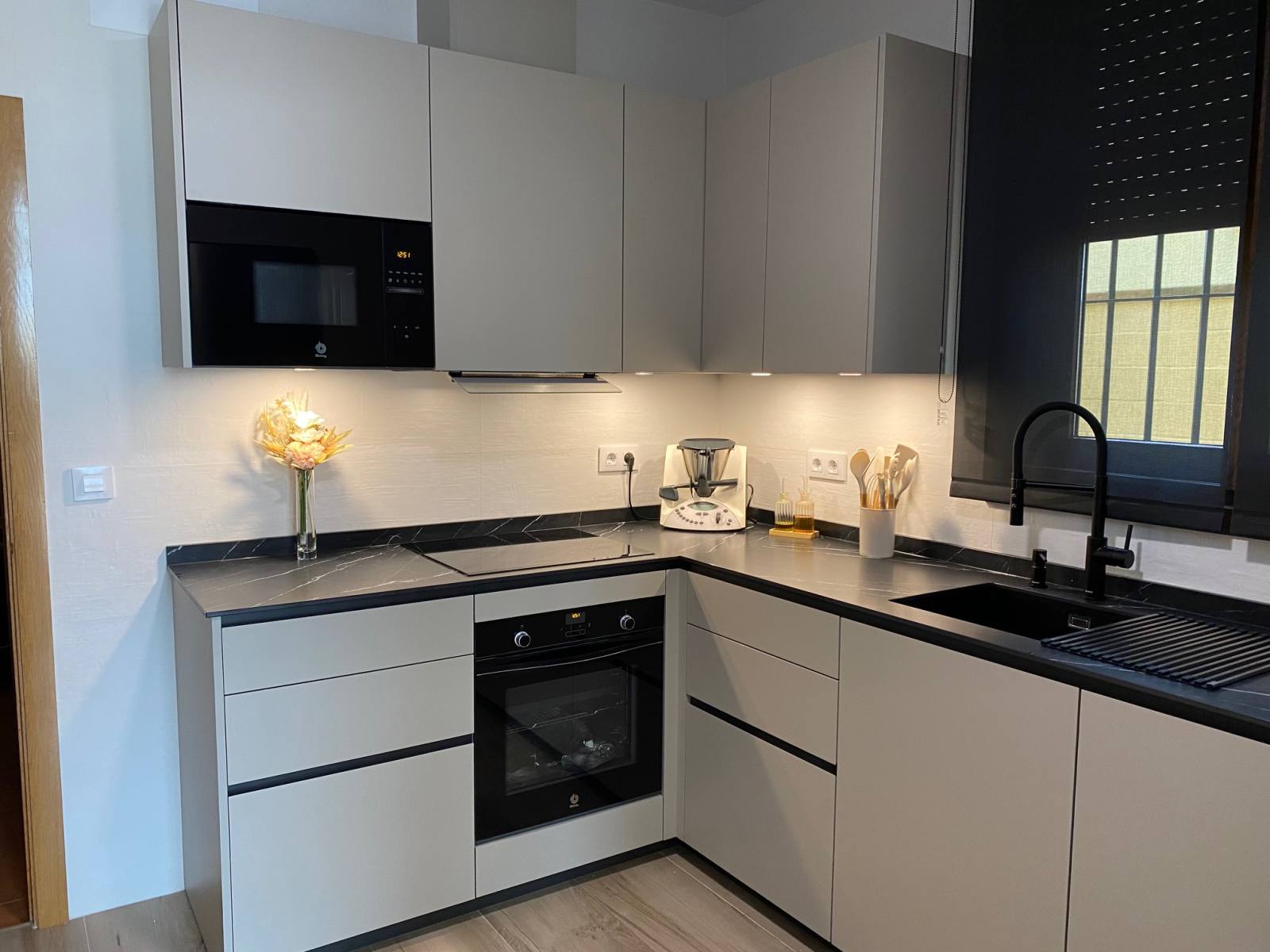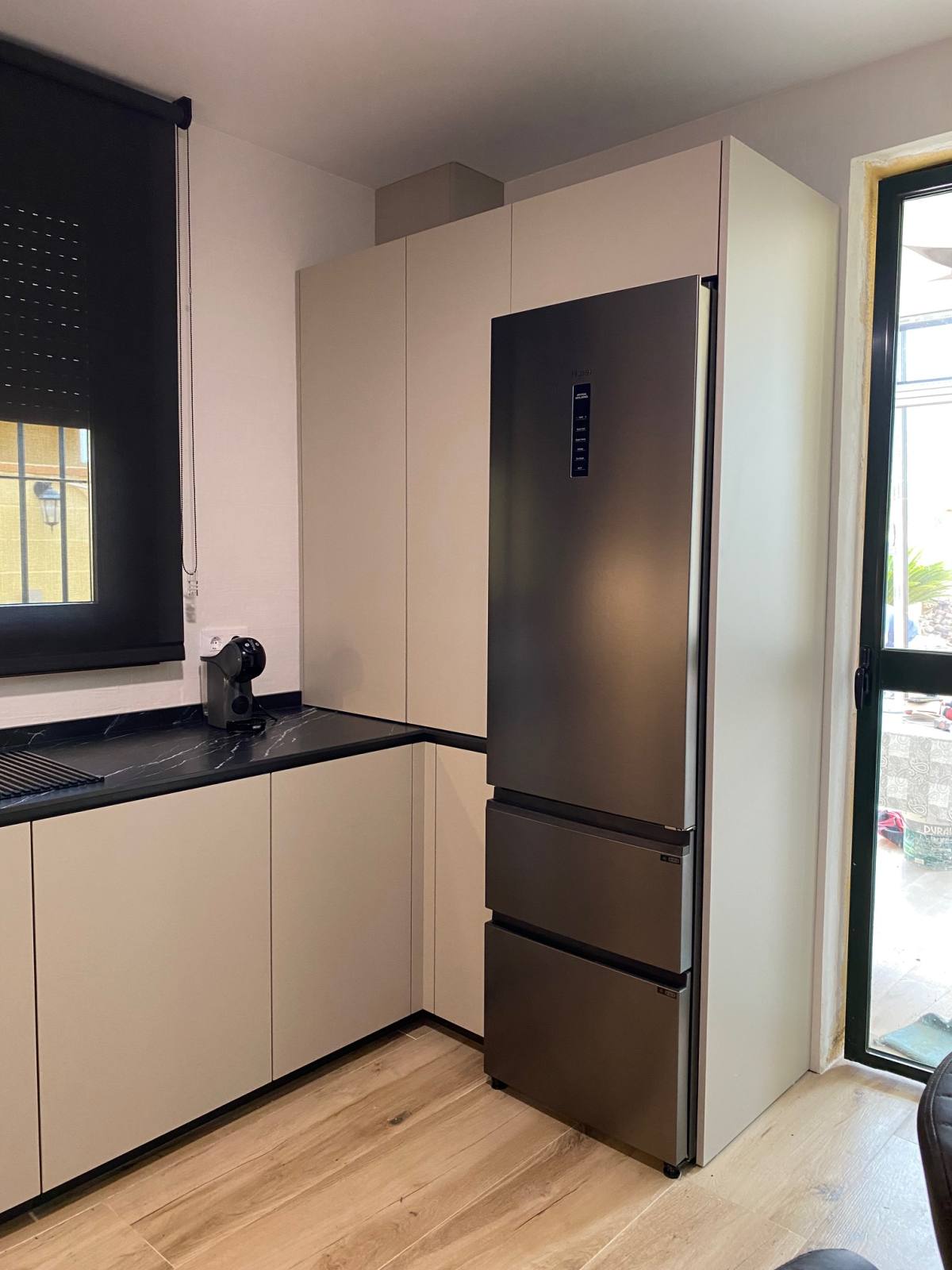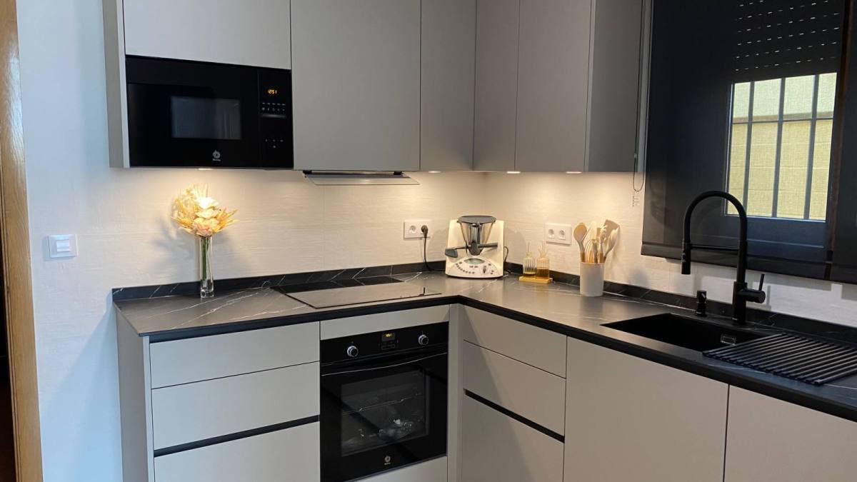 Una de las características más destacadas de esta cocina es su impresionante color Nude, que añade una sensación de calidez y modernidad al espacio. Pero no nos detuvimos ahí; para complementar este tono, instalamos una encimera veteada en Nero Marquina, que añade un toque de sofisticación y contraste perfecto. Además, para mantener una armonía visual, optamos por detalles en negro, como las golas, zócalos y electrodomésticos de la serie cristal.