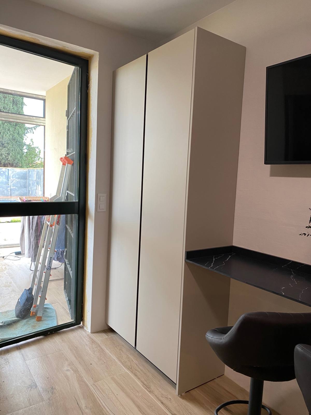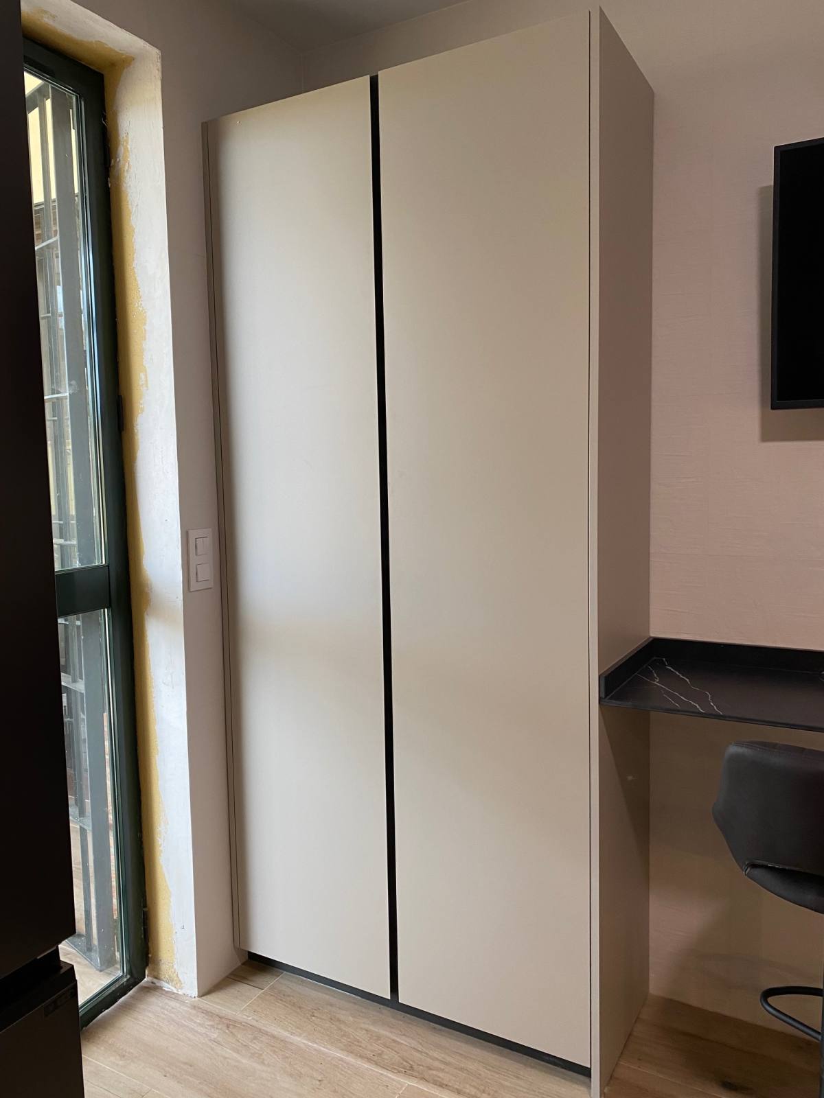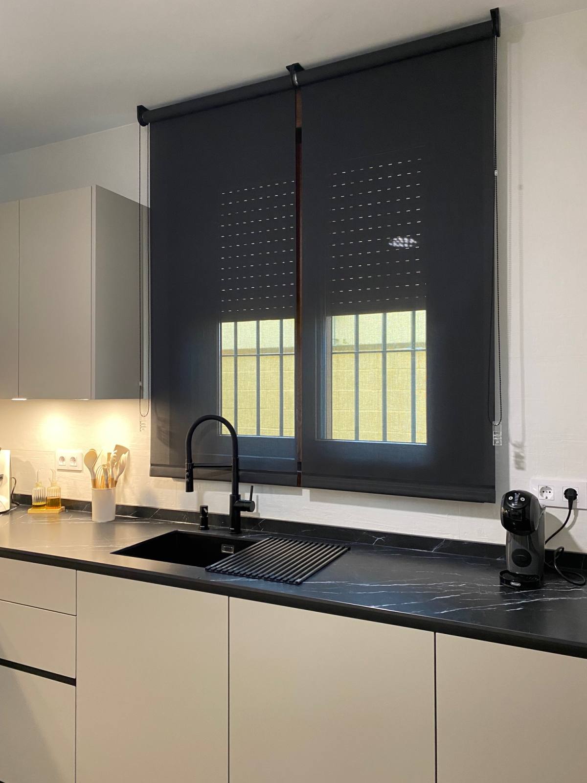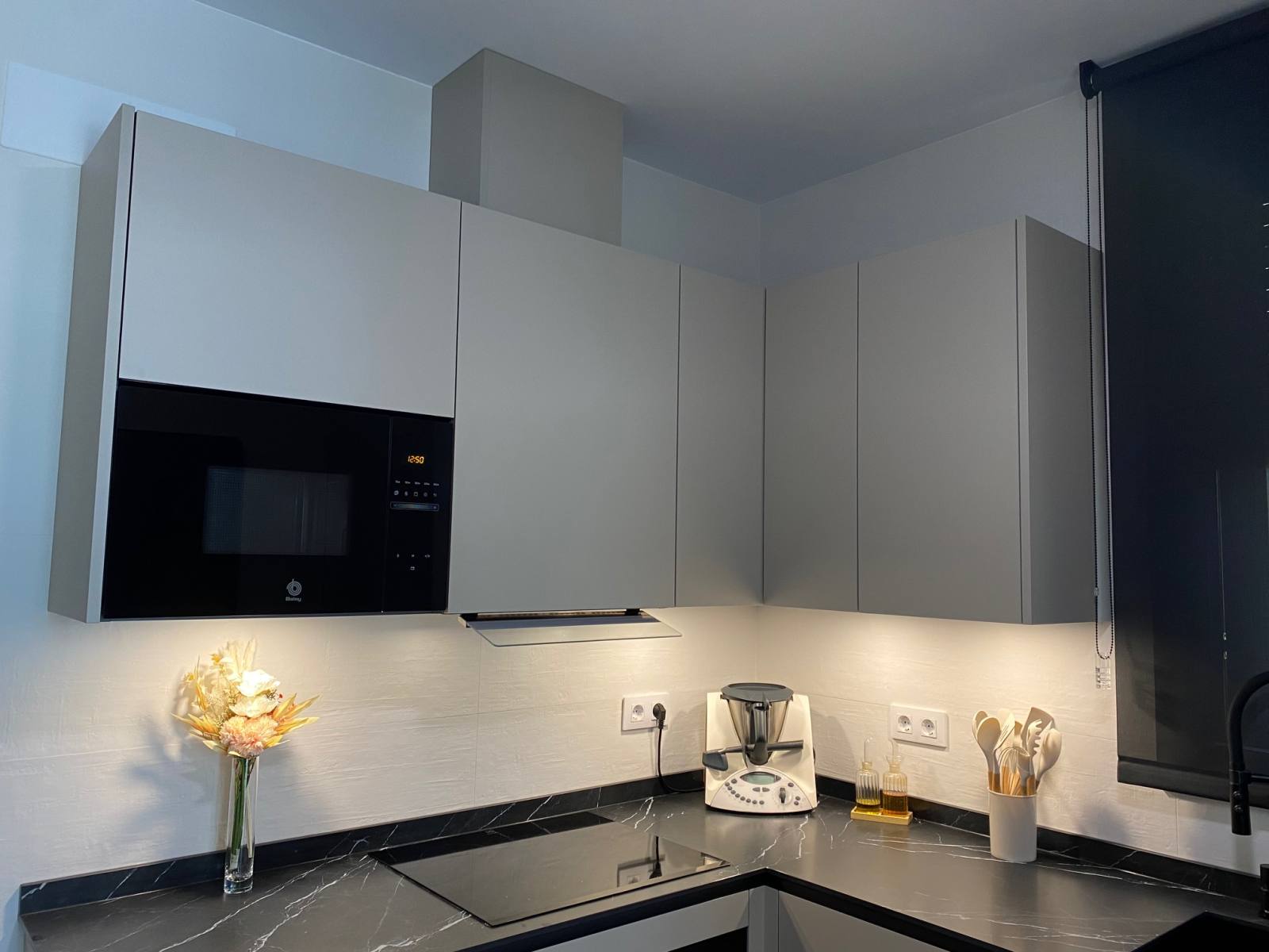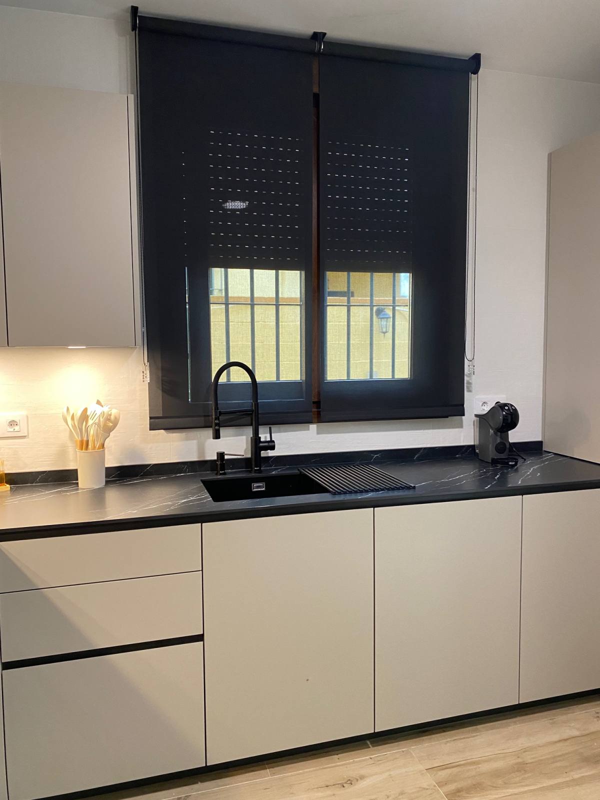 Una de las características más destacadas de esta cocina es su impresionante color Nude, que añade una sensación de calidez y modernidad al espacio. Pero no nos detuvimos ahí; para complementar este tono, instalamos una encimera veteada en Nero Marquina, que añade un toque de sofisticación y contraste perfecto. Además, para mantener una armonía visual, optamos por detalles en negro, como las golas, zócalos y electrodomésticos de la serie cristal.