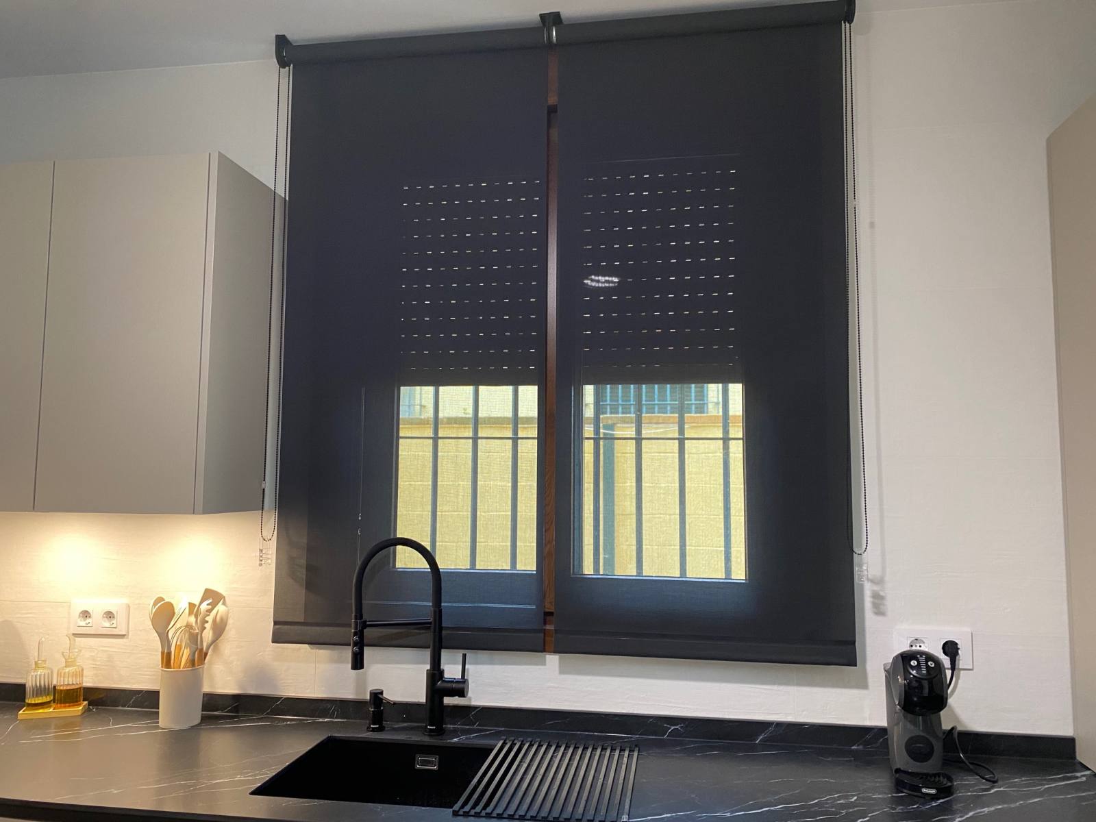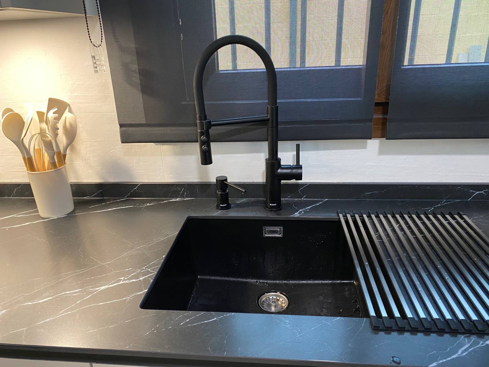 Entre los elementos que llaman la atención en esta cocina, se encuentra un frigorífico con cajones extraíbles, que no solo añade funcionalidad, sino que también contribuye al diseño elegante y minimalista. Además, el grifo de la reconocida marca Blanco en color negro es un verdadero punto focal que añade un toque de lujo y distinción.