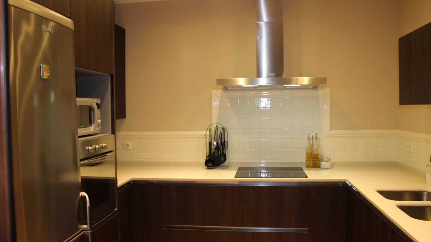 El horno y el microondas están integrados a su vez en un mueble columna que alcanza hasta el techo de la habitación y como es habitual, este mueble columna se sitúa junto al frigorífico que también tiene en su parte superior otro mueble a modo de altillo hasta el techo. Sobre el fregadero, hemos instalado un mueble apaisado con apertura basculante también en color nogal, como el resto de la cocina y sin tiradores.