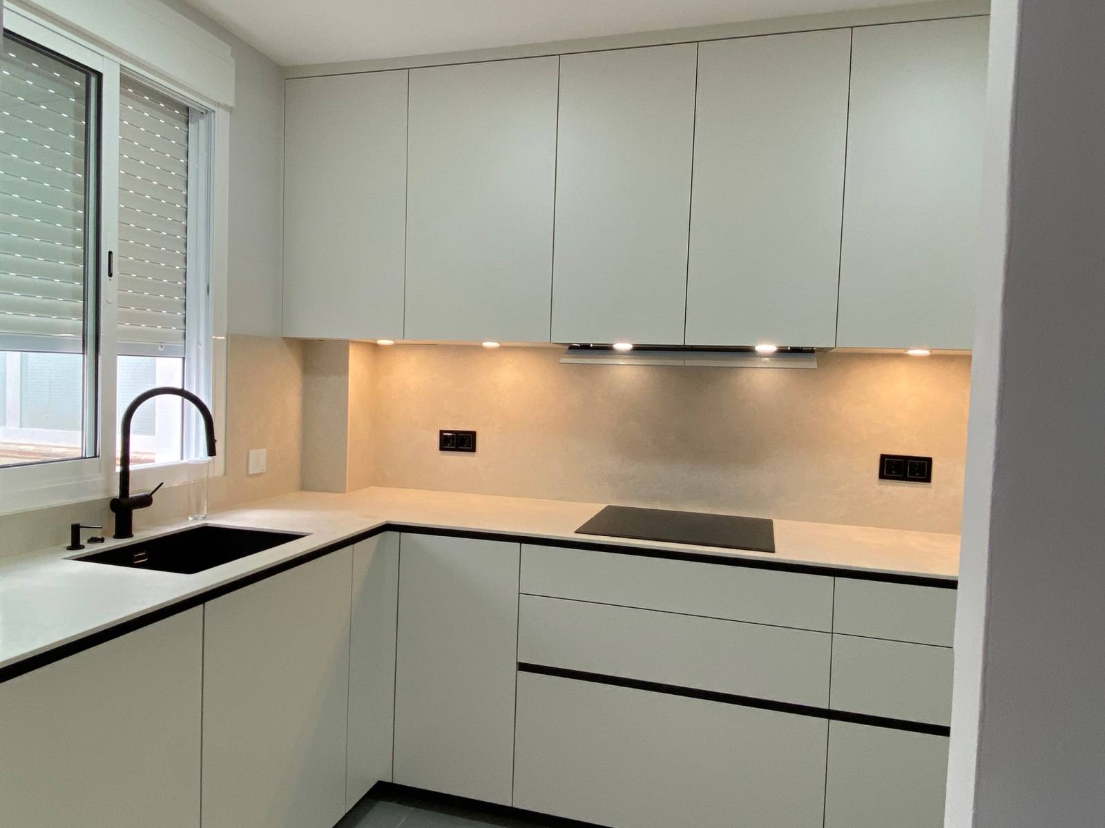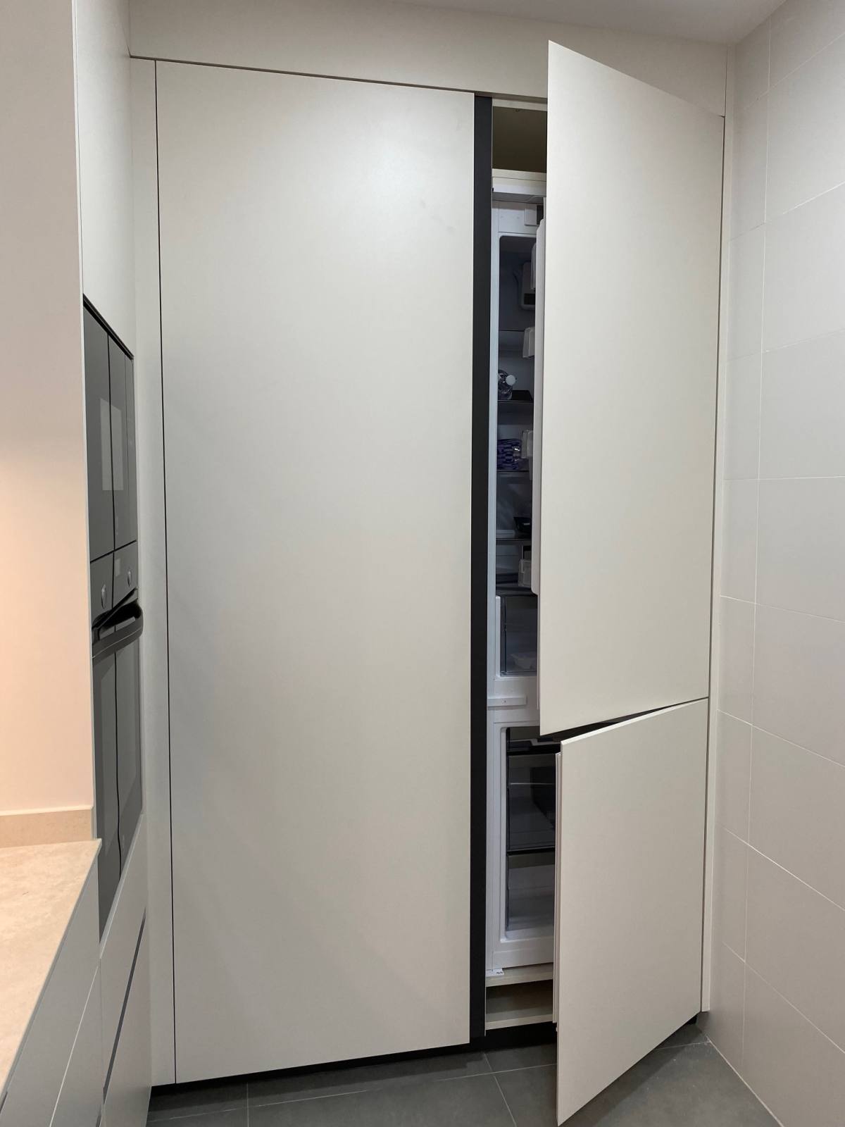 Los detalles marcan la diferencia en cualquier diseño de cocina. En esta cocina, la iluminación integrada y los elementos negros, como la zona de aguas y los mecanismos eléctricos, se combinan para resaltar y dar elegancia al ambiente. La elección de una encimera porcelánica de la marca INFINITY, modelo CHIANCA DI OSTUNI MATTE con un canto de 1,2 cm, añade un toque de sofisticación y durabilidad a la cocina.
